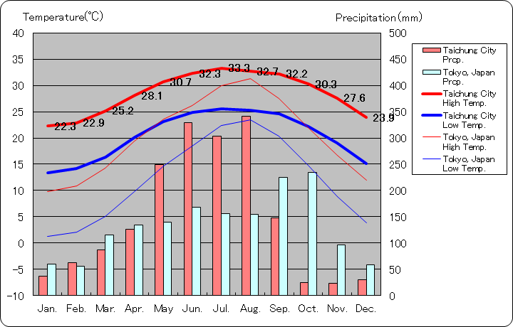 台中と東京の気温と降水量グラフ