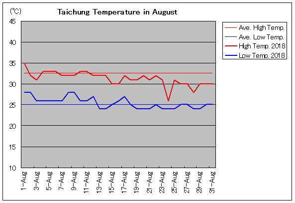 | 8月1日 | 32.6 / 25.1 | 35.0 / 28.0 | 0 | 8月16日 | 32.6 / 25.1 | 30.0 / 26.0 | 30 |