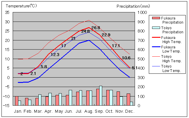 | Average High Temperature (°C) | 2 | 2.1 | 5.8 | 12.3 | 17 | 21 | 24.8 | 26.8 | 22.9 | 17.1 | 10.6 | 5.1 |