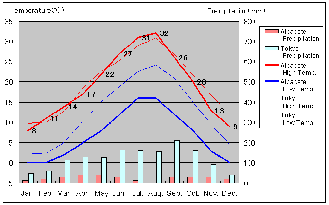 | Average High Temperature (°C) | 8 | 11 | 14 | 17 | 22 | 27 | 31 | 32 | 26 | 20 | 13 | 9 |