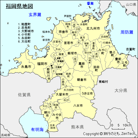| 島 | 能古島、玄界島、志賀島、小呂島、姫島、相島、地島、大島、馬島、藍島 |