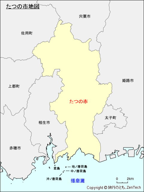 沖合い(播磨灘)には、地ノ唐荷島、中ノ唐荷島、沖ノ唐荷島があります。たつの市の周辺は、宍粟市、相生市、姫路市、佐用郡佐用町、赤穂郡上郡町、揖保郡太子町が位置しています。