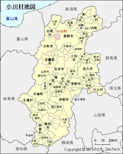 小川村(おがわむら)は、中部地方(甲信越地方、信越地方)・長野県の北信地方(長野地域)にある村(上水内郡)です。面積は 58.11平方キロメートル、長野県内では 61番目に面積の大きな自治体です。人口は 2,322人(2020年5月1日推計)、長野県では 66番目に人口の多い街です。