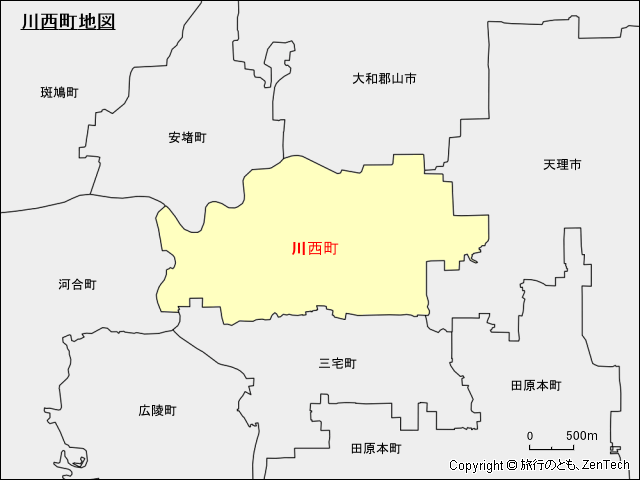 川西町の周辺は、大和郡山市、天理市、生駒郡安堵町、磯城郡三宅町、北葛城郡河合町が位置しています。