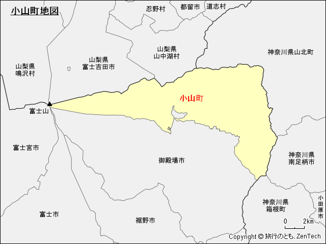 小山町(おやまちょう)は、中部地方・静岡県の東部にある町(駿東郡)です。面積は 135.74平方キロメートル、静岡県内では 14番目に面積の大きな自治体です。人口は 18,233人(2020年8月1日推計)、静岡県では 28番目に人口の多い街です。