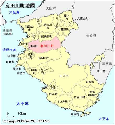 有田川町の周辺は、有田市、海南市、田辺市、有田郡湯浅町、広川町、海草郡紀美野町、日高郡日高川町、伊都郡かつらぎ町、奈良県吉野郡野迫川村が位置しています。