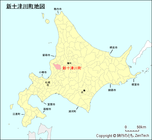 新十津川町(しんとつかわちょう)は、北海道の空知総合振興局(道央地方)にある町(樺戸郡)です。面積は 495.5平方キロメートル、北海道内では 67番目に面積の大きな自治体です。人口は 6,553人(2020年7月31日推計)、北海道では 81番目に人口の多い街です。