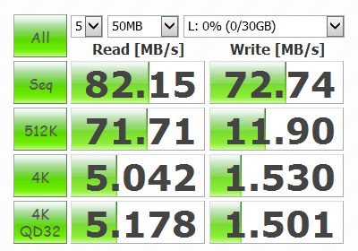 測定結果としては、公称値「読取り最大95MB/秒、書込み最大90MB/秒」までは行かないものの、概ね公称値の80%以上出ているので、さすがサンディスクです。ただし、ランダム・ライト(512K)の書き込み速度が何故だか遅いです。