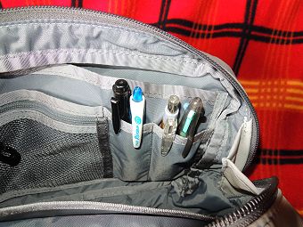 ![]() A内側前側左ポケットとBファスナー付メッシュポケット |