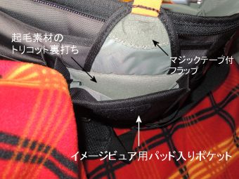 「イメージビュア用パッド入りポケット」は、ステルスリポーター D300AWの前から向かって右側にあるポケットで、幅 13cm×高さ(深さ)15cm×奥行き(最大)3cmです。前面がクッション入りで、背面が起毛素材のトリコット(経編(たてあみ)で作られた生地)で裏打ちされており、液晶ディスプレイに傷が付き難いように配慮されています。まぁ、最近ではイメージビュアを使う人は殆どいないですが、このポケットにスマートフォン(iphoneなら、高さ 123.8mm×幅 58.6mm×厚さ 7.6mm)を入れるのに丁度いいポケットです。ポケットの上には、面ファスナー(マジックテープ)付きのフラップがあり、収納物が落ちないようになっています。