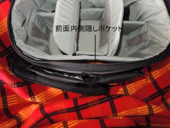 「前面全体薄ポケット」は、「イメージビュア用パッド入りポケット、最前面右半分ポケット」と「クッション入り収納部 」の間にあるポケットで、幅 27cm×深さ 19cm×奥行なしです。小さめの内ポケットが2つ(CFカードが入る程度の大きさ)作られています。A4サイズの紙を半分に折りたたんで入れられます。前部ポケットとメイン収納部に挟まれたおまけ的なポケットのため薄いものしか入らず、紙を入れるとシワシワになりそうなポケットです。