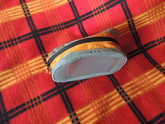 色分けされた12枚収納可能なメモリーウォレット」と記載されているのでこのように書いていますが、簡単に言うと「布製メモリーカード入れ」で、開閉はファスナーです。サイズは、文庫本と同等の大きさで、メジャーで測ると長辺 16cm×短辺 10.5cm×厚さ 約1cm(ファスナーの所を測ると2cm)でした。フォトジャーナリストの人は、情報統制のある国で撮影した重要なメモリーカードをこのメモリーウォレットに入れて、前面内側隠しポケットに収納し、極秘潜入レポートをするのでしょうか?ってことはさておき、メモリーウォレットの中は下の写真のように背面が灰色とオレンジ色に色分けされています。多分、使用前と使用後の区別をし易いようにするためです。メモリーウォレットの裏側には「スリップロックのタブ(ベルトに通す帯のようなもの)」があり、隠しポケットに入れなくても男性ならズボンのベルト(もちろん女性でも服装次第で可能)にメモリーウォレットを取り付ける(面ファスナー使用)ことが出来ます。