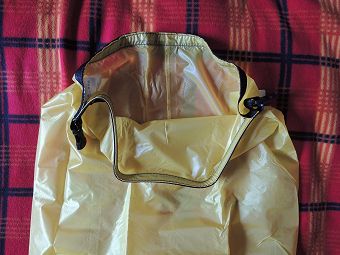 と、まぁこんな商品です。黄色の薄地素材で型番は「ULB030」です。容量は30リットルです。底面は、円形で直径は28センチメートルです。底面から開口部までの長さは66センチメートルです。素材は、商品パッケージの記載では「Siliconised 30D CORDURA(シリコン加工された30デニールのコーデュラ)」であり、商品のタグには「90%NYLON / 10%PU(ナイロン90% / ポリウレタン10%)」です。コーデュラは、軽量かつ耐久性のある素材として定評があるようです。シリコン加工(撥水加工)が施され、内側の縫い目にはシーム・テープで目止めされ防水性を確保しています。開口部は、大型の防水袋と異なり面テープ(マジックテープ)で止めるような構造ではありませんが、キャンバス地?の厚手生地をテープ状に張られ、そのテープのところをクルクル巻いてバックル留めして水の浸入を防ぐ構造です。