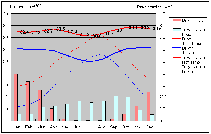 ダーウィンの年間平均気温 28.1℃、年間平均最高気温 32.7℃、年間平均最低気温 23.6℃、年間降水量 1,533ミリメートル、年間降水日数 93日、1882年から1942年まで61年間の平均値、オーストラリア気象局データ