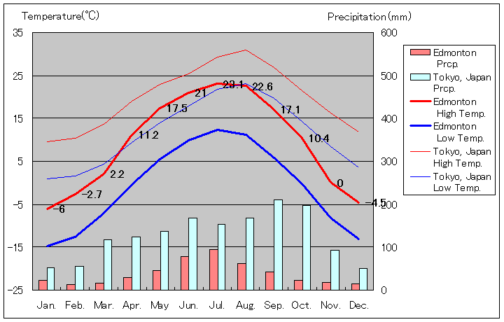 1981年から2010年、エドモントンと東京の気温と降水量グラフ