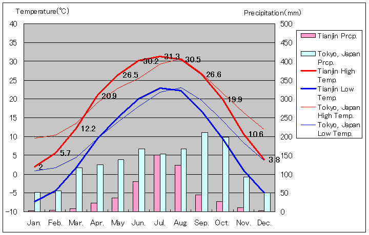 天津の年間平均気温 13.8℃、年間平均最高気温 18.5℃、年間平均最低気温 9.1℃、年間降水量 521ミリメートル、年間降水日数 63日、年間日照時間 2,460.4時間、1991年から2020年まで30年間の平均値、過去最高・最低気温は1951年から現在までの極値、中国気象局(CMA = China Meteorological Administration)データ