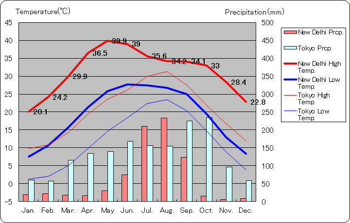 1981年~2010年、ニューデリーと東京の気温と降水量グラフ