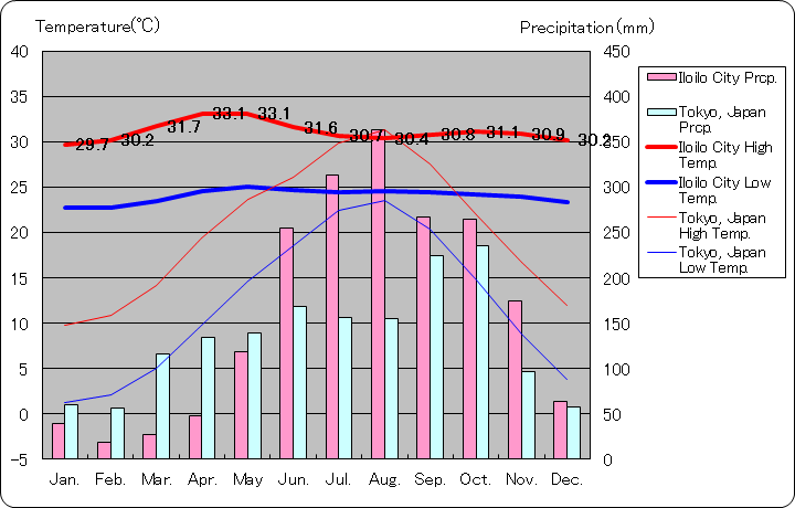 イロイロ・シティの年間平均気温 27.6℃、年間平均最高気温 31.1℃、年間平均最低気温 24.0℃、年間降水量 1,954ミリメートル、年間降水日数 170日、1961年から1990年まで30年間の平均値、過去最高・最低気温は1903年から2012年までの極値、「Climate Charts(climate-charts.com)」データ、ドイツ気象局(DWD = Deutscher Wetterdienst)データ、フィリピン大気地球物理天文局(PAGASA = Philippine Atmospheric, Geophysical and Astronomical Services Administration)データ