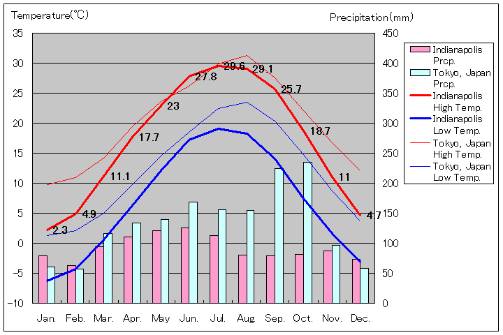 インディアナ州インディアナポリス月別気温(Temperature & Precipitation of Indianapolis, State of Indiana, United States of America):インディアナ州の州都であり最大都市、アメリカ合衆国で17番目に人口の多い都市、人口 887,642人(2020年現在)