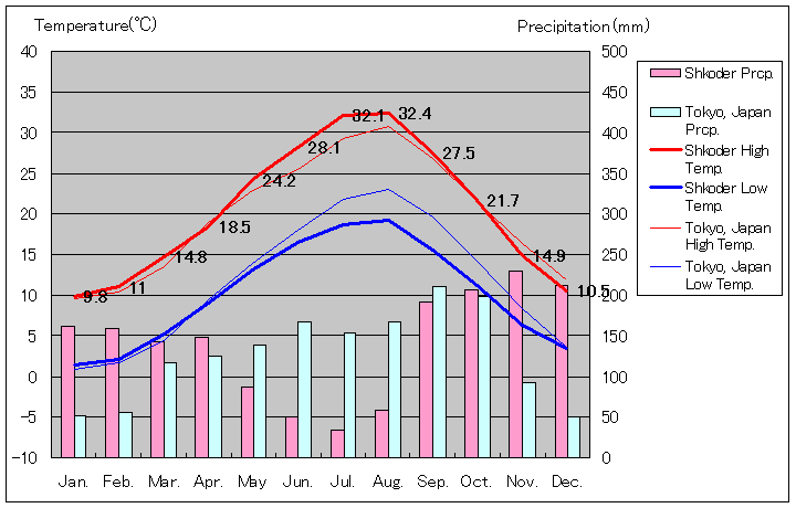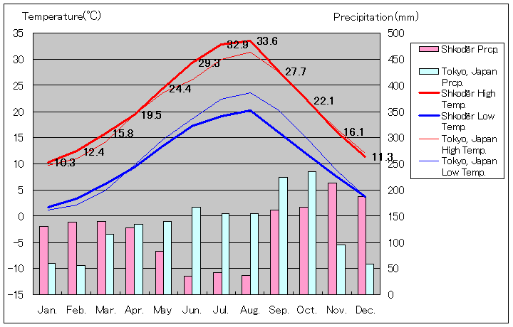 シュコドラ州シュコドラ県シュコドラと東京の気温および降水量グラフ(1991年から2020年までの平均値)