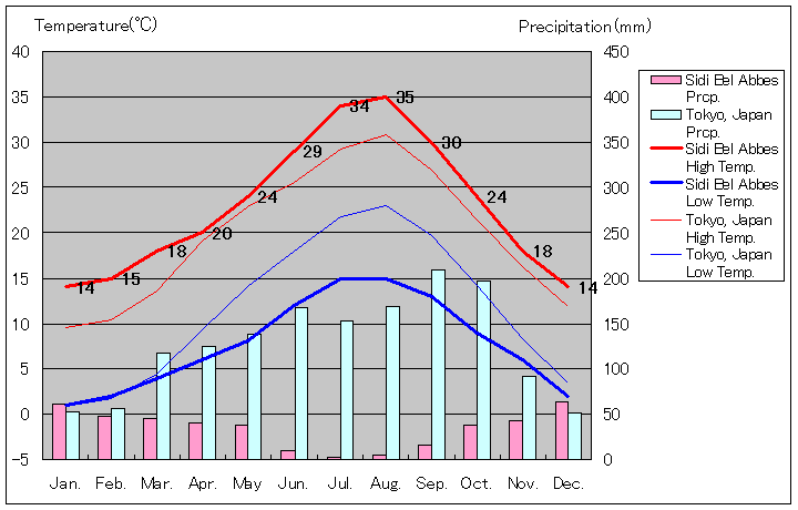 シディ・ベル・アッベスと東京の気温および降水量グラフ
