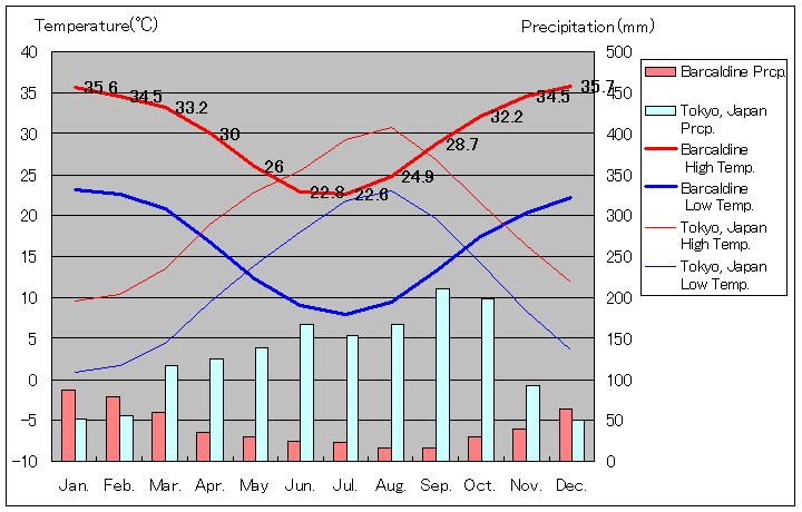 クイーンズランド州バーカルディンと東京の気温および降水量グラフ