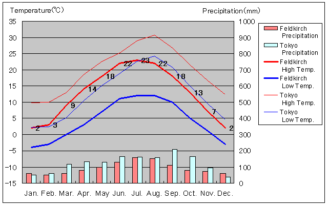 フェルトキルヒと東京の気温および降水量グラフ
