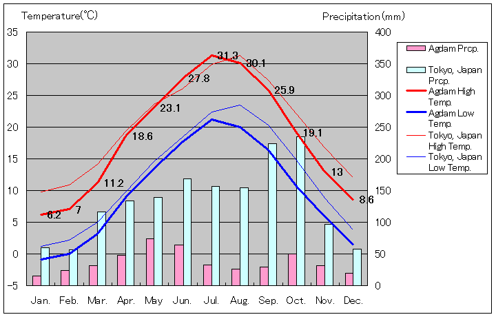 アグダムと東京の気温および降水量グラフ(1971年から1990年までの平均値)