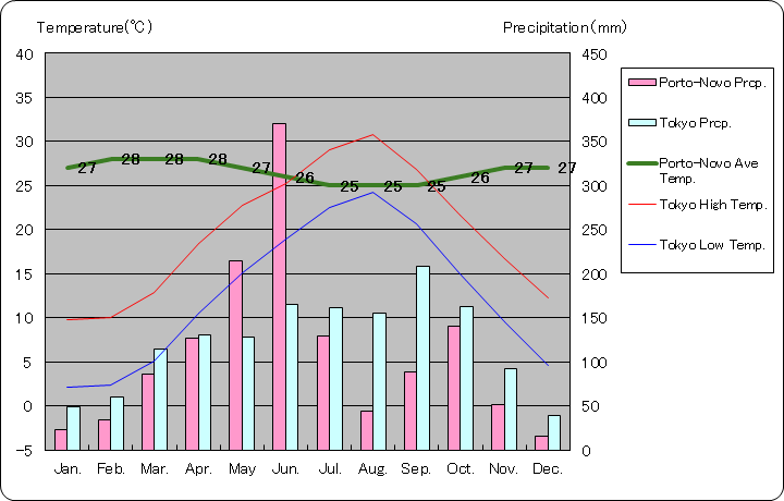 ポルトノボの年間平均気温 26.6℃、年間降水量 1,325ミリメートル、「Weatherbase」データ