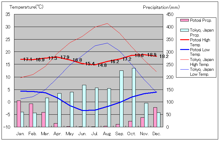 ポトシの年間平均気温 9.1℃、年間平均最高気温 17.1℃、年間平均最低気温 1.1℃、年間降水量 430ミリメートル、年間降水日数 85日、ボリビア国立気象センター(Servicio Nacional de Meteorología e Hidrología de Bolivia)データ、南緯 19度35分21秒 西経 65度45分12秒、標高 3,950メートル(12,960フィート)