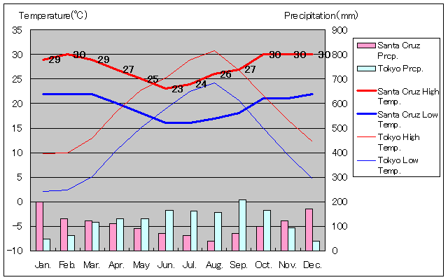 サンタ・クルス県サンタ・クルス月別気温(Temperature & Precipitation of Santa Cruz de la Sierra, Santa Cruz Department, Bolivia):サンタ・クルス県の県庁所在地(県都)となっている都市、人口 1,441,406人(2012年時点)、ボリビアの最大都市です。正式名称は「サンタ・クルス・デ・ラ・シエラ (Santa Cruz de la Sierra) 」です。