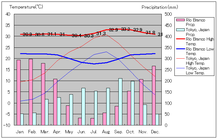 アクレ州リオブランコ月別気温(Temperature & Precipitation of Rio Branco, Acre State, Brazil):アクレ州の州都となっている都市、人口 387,852人(2024年現在)、ブラジルで 61番目に人口の多い街です。