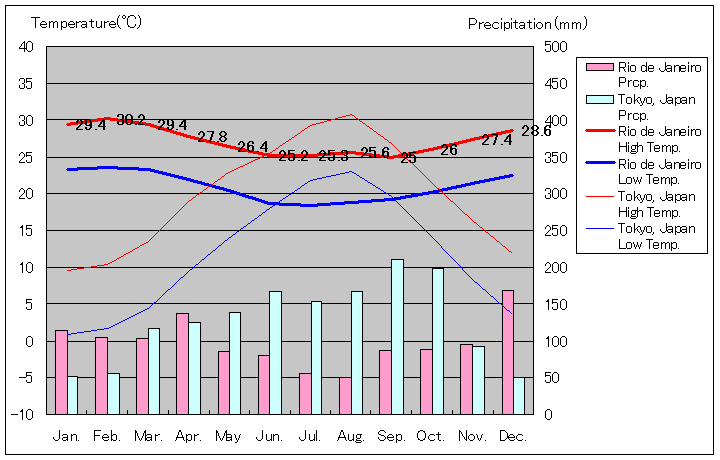 リオデジャネイロと東京の気温と降水量グラフ(1961年から1990年までの平均値)