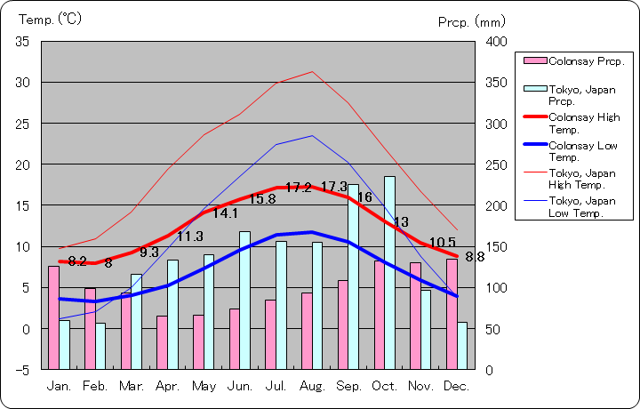 スコットランド地方ハイランド インナー・ヘブリディーズ諸島コロンゼー島と東京の気温および降水量グラフ(1991年から2020年までの平均値)