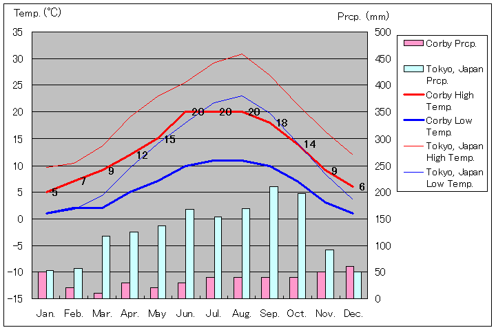 イングランド地方イースト・ミッドランズ ノーサンプトンシャー州コルビー(コービー)と東京の気温および降水量グラフ