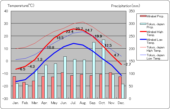 | 平均最高気温(℃) | -6.5 | -4.3 | 1.3 | 10.8 | 18.5 | 23.4 | 25.7 | 24.7 | 19.9 | 12.5 | 4.7 | -2.7 |