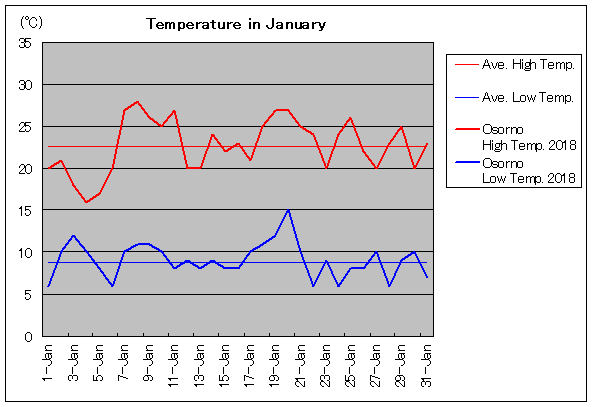 | 1月3日 | 22.6 / 8.8 | 18.0 / 12.0 | 28 | 1月18日 | 22.6 / 8.8 | 25.0 / 11.0 | 0 |