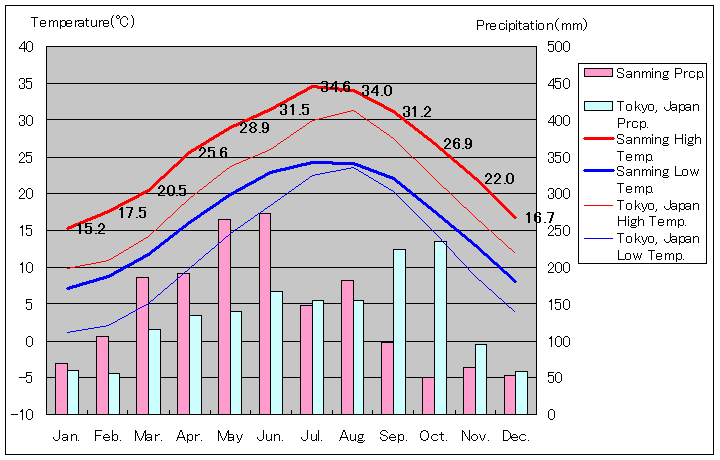 福建省 三明(サンミン)月別気温(Temperature & Precipitation of Sanming, Fujian, China)