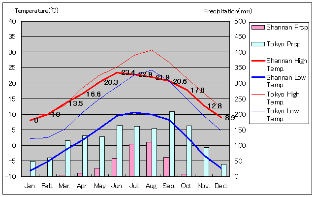 | 平均最高気温(℃) | 8.0 | 10.0 | 13.5 | 16.6 | 20.3 | 23.4 | 22.9 | 21.9 | 20.6 | 17.8 | 12.8 | 8.9 |