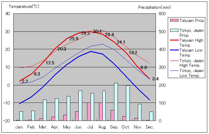 太原の年間平均気温 10.9℃、年間平均最高気温 17.3℃、年間平均最低気温 4.5℃、年間降水量 423ミリメートル、年間降水日数 70日、年間日射量 2,502時間、1981年から2010年まで30年間の平均値、中国気象局データ