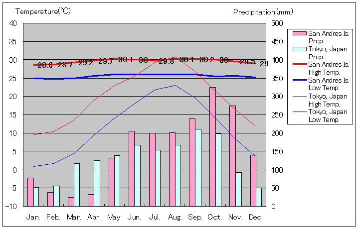 サン・アンドレス・イ・プロビデンシア県サン・アンドレス島月別気温(Temperature & Precipitation of San Andrés City, San Andres Island, Colombia):人口 67,912人(2007年現在)、コロンビア本土のカルタヘナから北西へ720キロメートルのカリブ海にサン・アンドレス島があります。ニカラグアからは東へ200kmです。