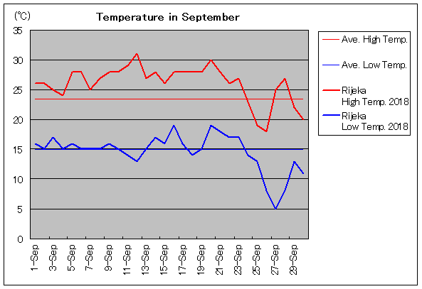| 9月2日 | 23.5 / 14.9 | 26.0 / 15.0 | 7 | 9月17日 | 23.5 / 14.9 | 28.0 / 16.0 | 0 |
