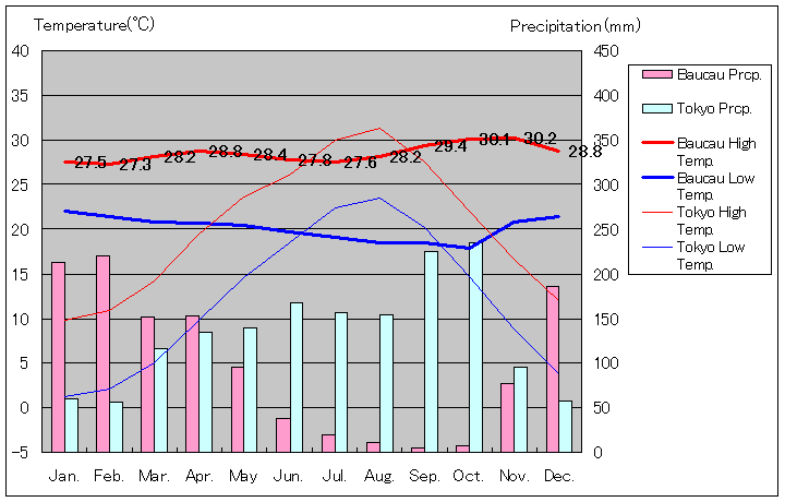 バウカウと東京の気温および降水量グラフ(1917年から1963年までの平均値)