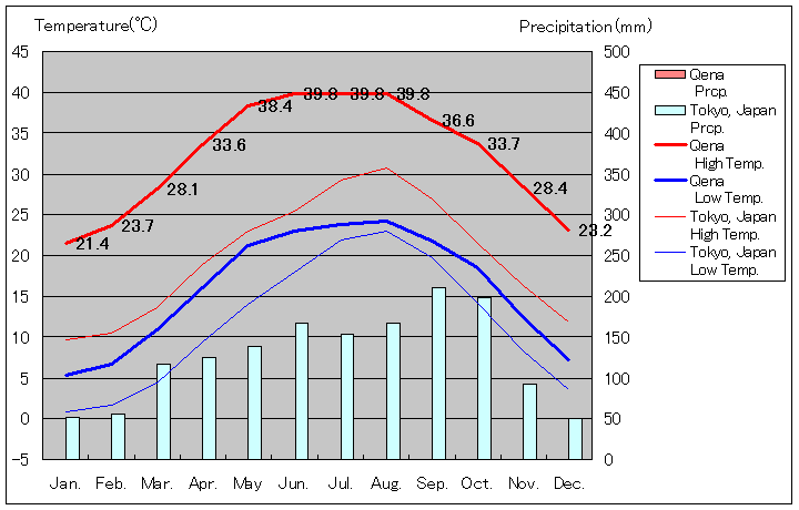 キーナ県キーナ月別気温(Temperature & Precipitation of Qena, Qena Governorate, Egypt):キーナ県(キナ県)の県庁所在地となっている都市、人口 230,392人(2012年現在)、古代ローマ時代には「ケネポリス(Caenepolis)」と呼ばれた都市です。キーナから北東へ紅海沿岸にあるサファーガへのキャラバン・ルート(60号線)があります。