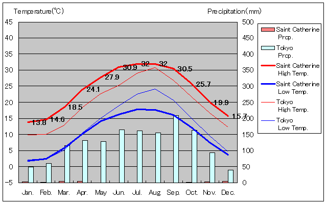 セント・カトリーナの年間平均気温 17.1℃、年間平均最高気温 23.8℃、年間平均最低気温 10.4℃、年間降水量 21ミリメートル、年間降水日数 0.4日