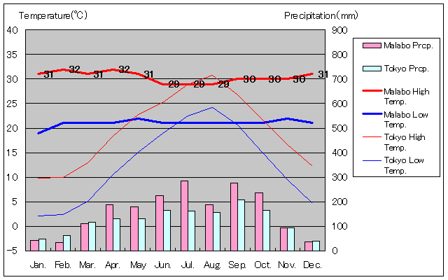 マラボの年間平均気温 26.6℃、年間平均最高気温 30.0℃、年間平均最低気温 23.3℃、年間降雨量 1,869ミリメートル、年間降雨日数 153日、年間日射量 1,050.3時間、1961年から1990年まで30年間の平均値、ドイツ気象局(DWD = Deutscher Wetterdienst)データ