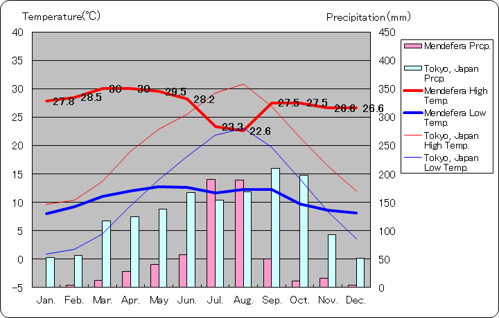 デブブ地方メンデフェラ月別気温(Temperature & Precipitation of Mendefera, Debub Region, Eritrea):デブブ地方の首府、人口 63,492人(2012年時点)、エリトリア第5の都市