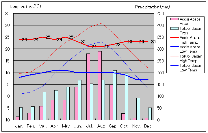 アディスアベバと東京の気温と降水量グラフ(1991年から2020年までの平均値)