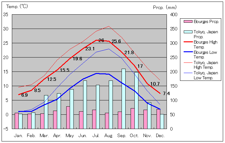 ブールジュと東京の気温と降水量グラフ(1981年から2010年まで30年間の平均値)