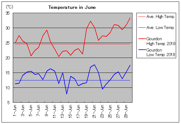 | 6月3日 | 24.6 / 12.4 | 25.6 / 14.1 | 0 | 6月18日 | 24.6 / 12.4 | 21.2 / 11.3 | 0 |